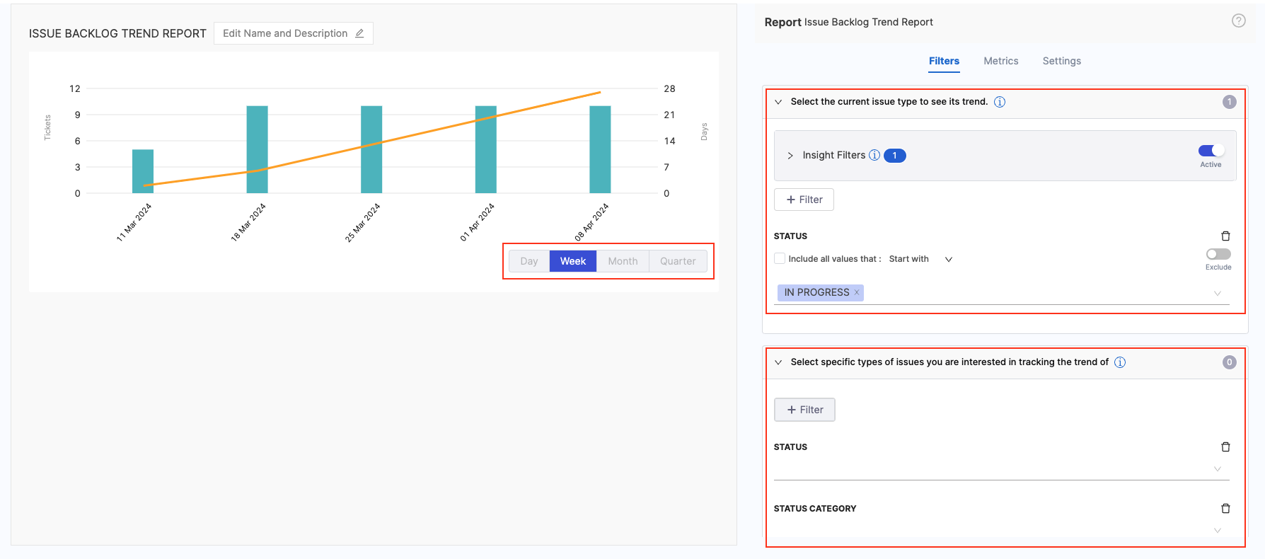 - You can define the settings for the current issue type using the existing filters. Additionally, you can set preferences for tracking trends related to specific issue types using historical data filters i.e. Status and Category.