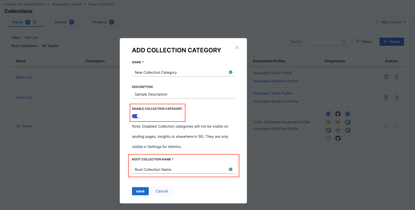 Each Harness project has two default Collection categories: Teams and Sprints. You can modify the default categories and create custom categories.