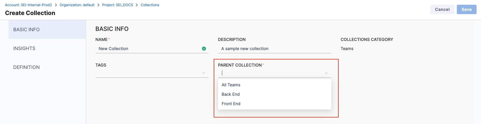 Inheritance flows down the Collection levels. For example, Collection categories and Collections inherit SEI integrations from the associated Harness project, and child Collections inherit Insights associations from their ancestor Collections. For more information about the relationship between projects, Collection categories, and Collections, go to Collection hierarchies.