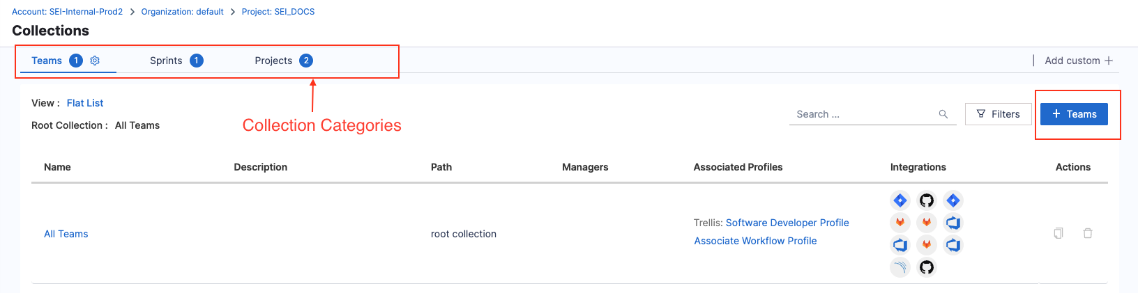Collections are groupings representing subdivisions of a Collection category. By default, each Collection category has one root, or All, Collection. For example, the Teams category automatically has an All Teams Collection. Under the root Collection, you can create any number of Collections and Collection levels.