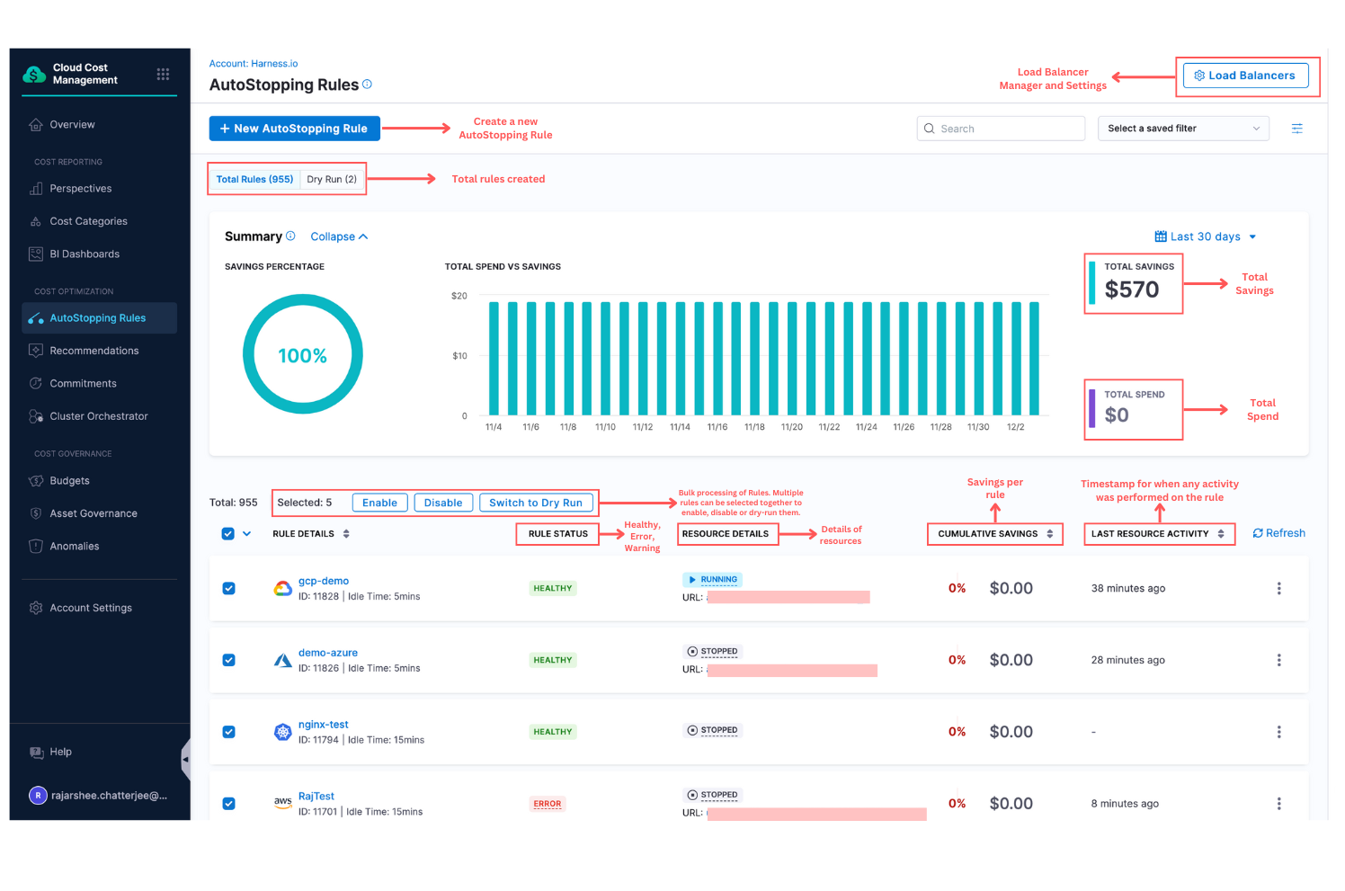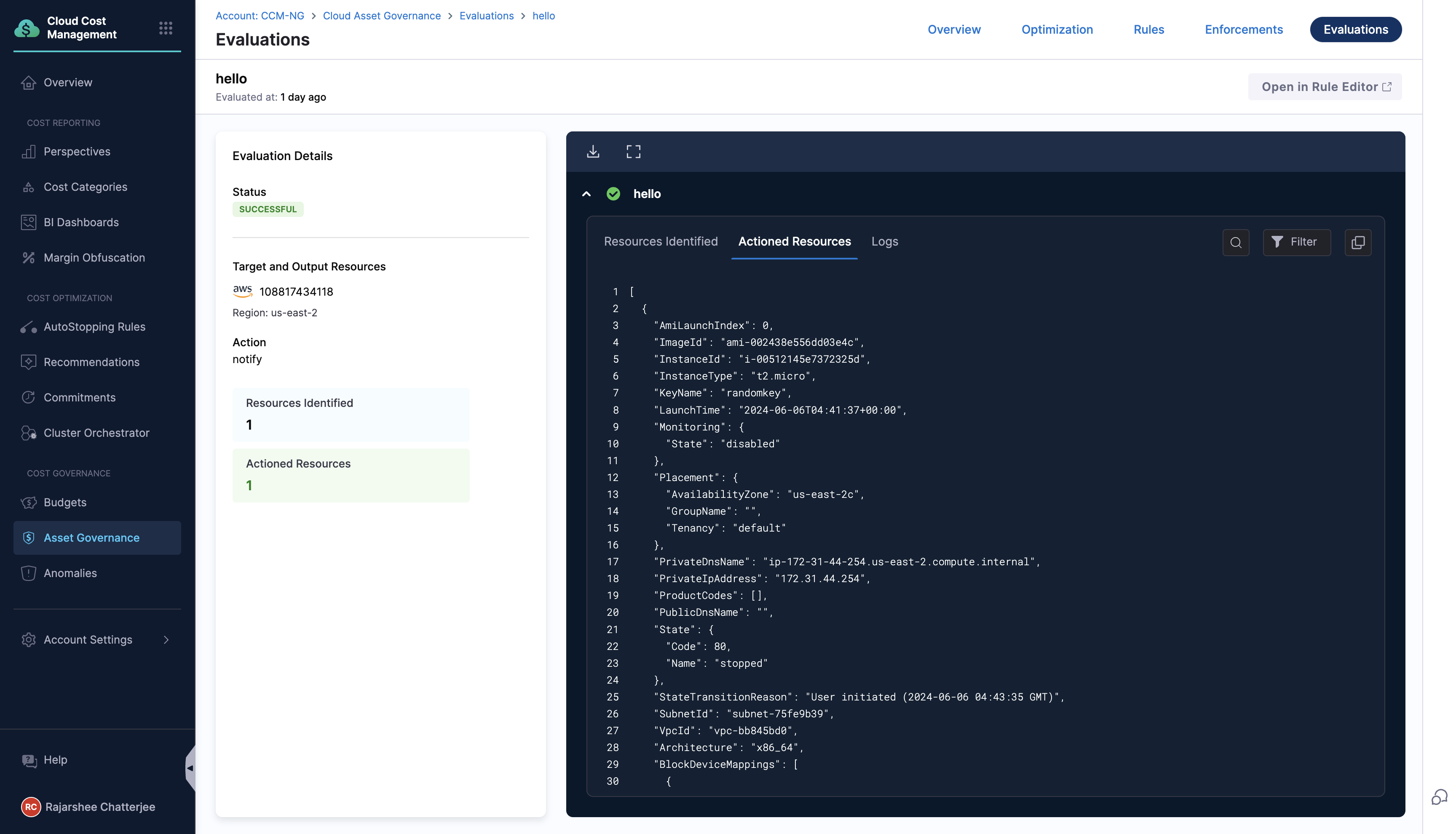Savings will be calculated for rules that are created and resources are being utilized. Rules created with valid resources will display savings numbers as long as the resource is valid and cost data is available in the Cloud Usage Report (CUR). Resources that are onboarded in "Down" state and not used after rule creation will not show any savings, as the details of such resources will be completely missing in the CUR.