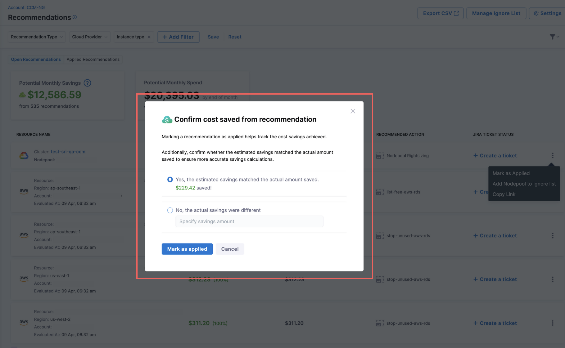 Recommendations Breakdown: We’ve added realized savings from Recommendations to the Recommendations Breakdown widget on the CCM Overview page. [CCM-26915]