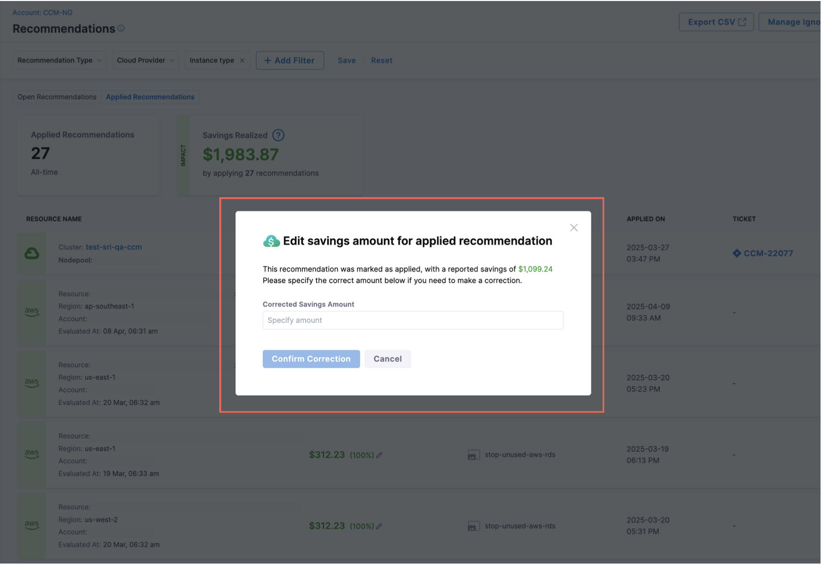- Governance Recommendations: Resolved an issue where multiple "remove from ignore list" options were appearing for ignored Governance recommendations. The interface now correctly shows a single option to remove from the appropriate ignore level. [CCM-28071]